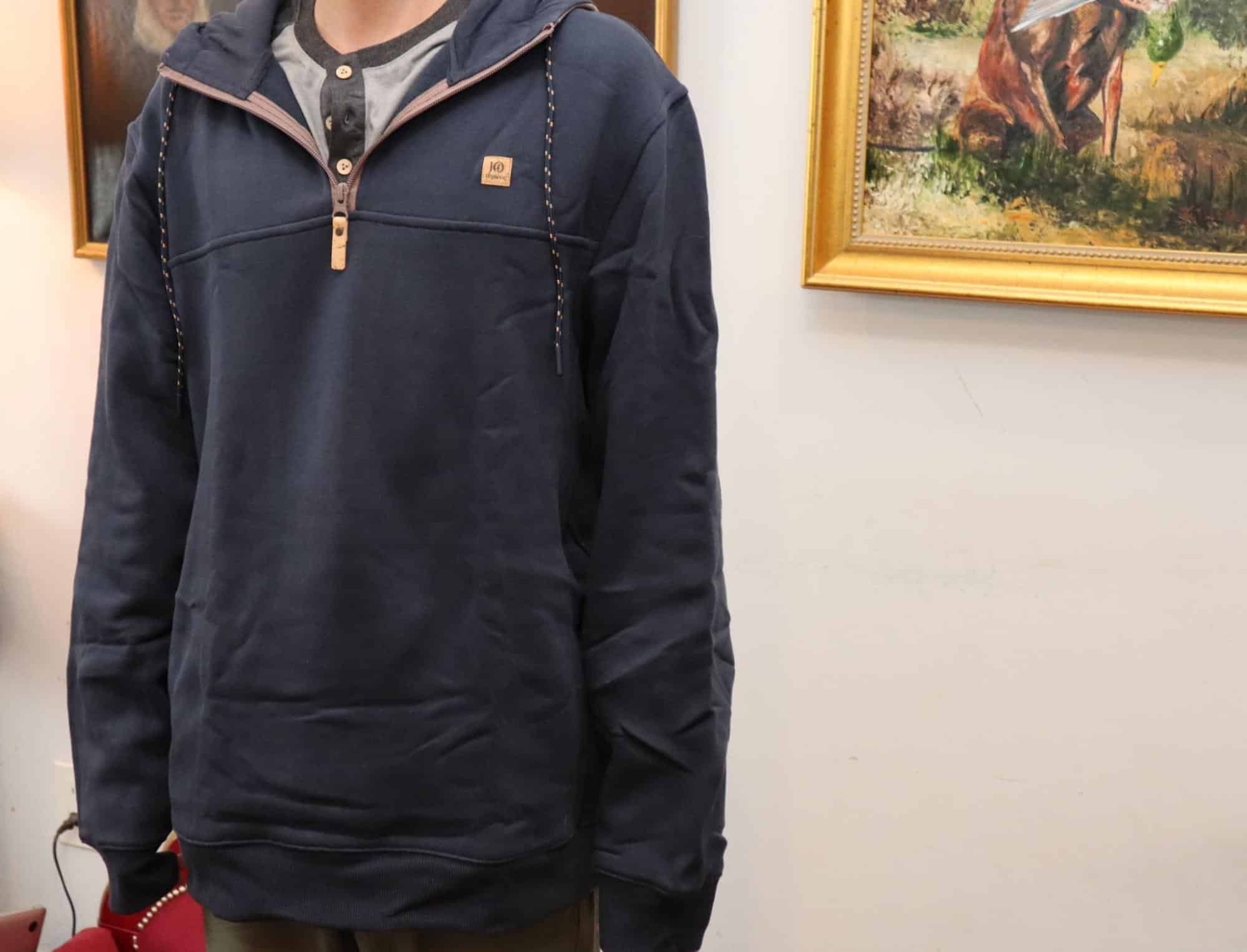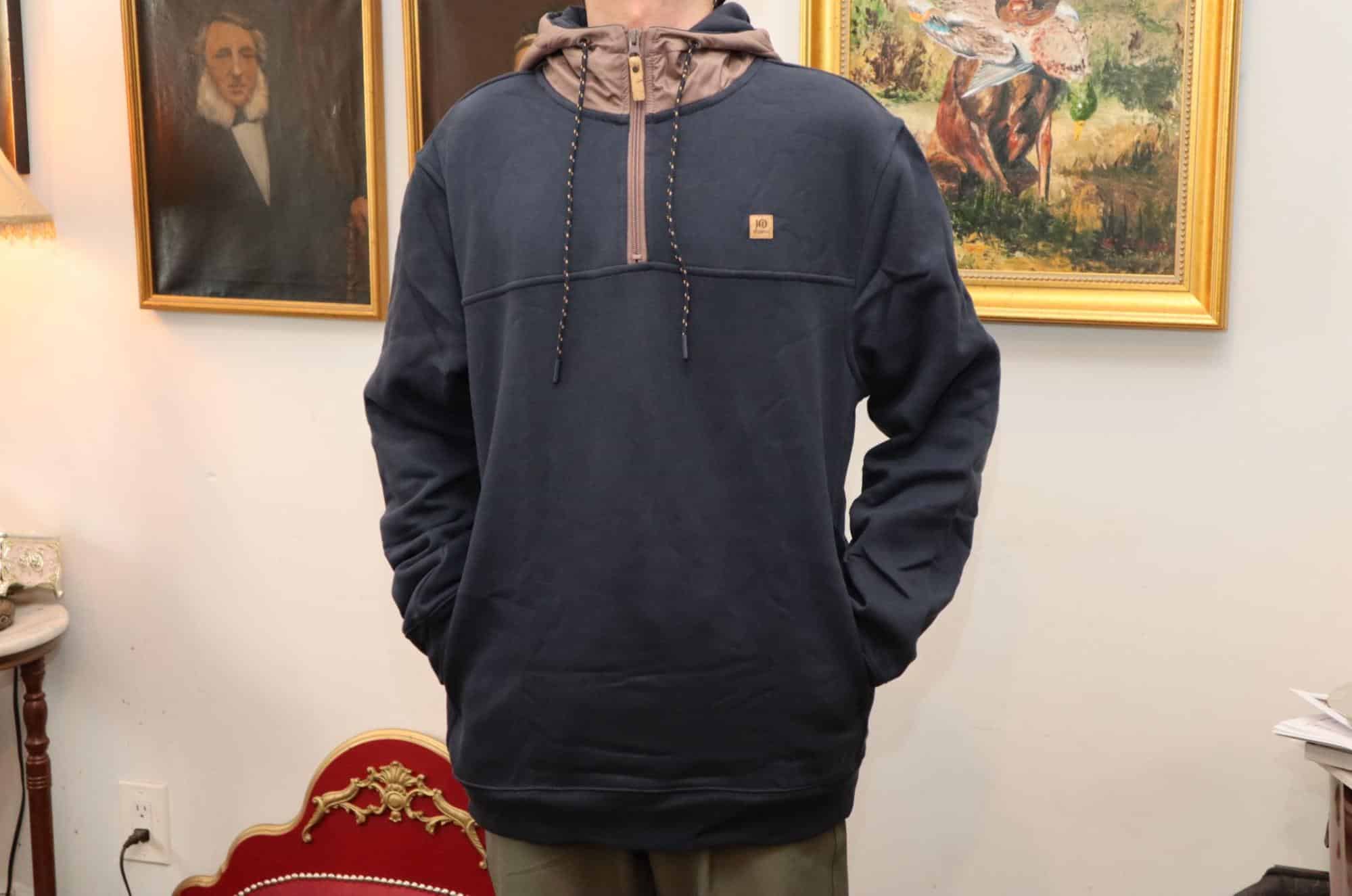 The Tentree Whistler ¼ Zip is a functional hooded quarter-zip sweater with a two-tone, multi-material aesthetic. The main colorway features a dark blue cotton body and a tech-material hood and collar in elkwood, a cool medium brown. At the time of this writing, there’s also a special edition in khaki with a dark teal hood.