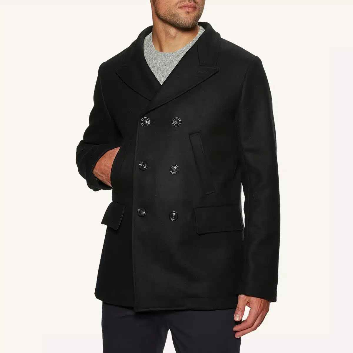 Peacoats have a double-breasted design. For many short and slim men, this helps to broaden the chest area, creating a more structured and proportional look. Overall, if you think a topcoat is too long, a peacoat will likely be the perfect alternative
